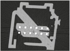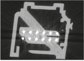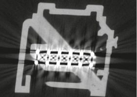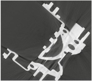 - Hintergrund: Wenn ein Bauteil aus Materialien mit stark unterschiedlichen Dichten besteht (z. B. Kunststoff und Metall), können Streifen- und Schattenartefakte auftreten. Diese entstehen durch ungleichmäßige Absorption der Röntgenstrahlung und beeinträchtigen die Bildqualität.